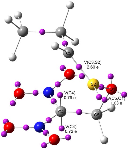 In the ELF structure, a disynaptic basin with a single attractor between the carbon and sulfur atoms can be observed. V (C3, S2) has a population of 2.91 e, corresponding to a slightly underpopulated bond of 1.5 order. A monosynaptic valence basin V (S2) with a population of 3.34 e corresponds to an overpopulated lone electron pair of the sulfur atom. Between the oxygen atom and the sulfur atom, a disynaptic basin V (S2, O1) can be observed, with a population of only 1.29 e, which can be translated to a bond order of only 0.6. At the oxygen atom (at an isovalue of 0.8), a reducible [] domain composed of two V (O1) valence basins is observed. The domain has a population of 6.06 e, which corresponds to three lone pairs of the oxygen atom.