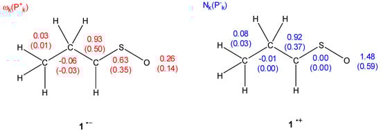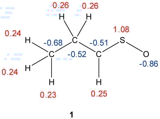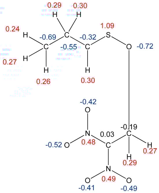 Natural charges of atoms (in electrons) in the S-oxide Xet, as computed at the ground state in the gaseous phase (B3LYP/6-31G(d)); charges > 0.2 e are given in red, and charges < −0.2 are given in blue.