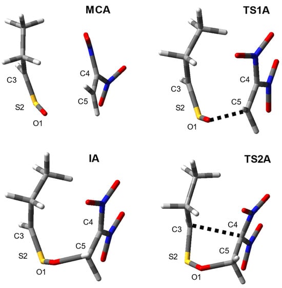 The further conversion of the MC intermediates led to the respective transition states (TSA for path A, TSB for path B, TSC for path C, and TCD for path D, respectively). This process required an increase in the enthalpy of the reaction of about 17–20 kcal/mol, depending on the reaction path. At the same time, the entropy of the reaction was reduced, which, in turn, caused an increase in the Gibbs free energies. From a kinetic point of view, the preference of the theoretically possible reaction paths can be presented in the order of B > D > A > C. Within the localized TSs, all the key interatomic distances adopted values typical for new single bonds in transition states [,,,]. It should be underlined that the distance near the β-carbon atom located in the nitrovinyl moiety was always substantially shorter than the second one. In turn, this confirmed the importance of the local nucleophilic/electrophilic interactions determined above. Similarly to the process of the formation of new single bonds, the electron density was transferred from the S-oxide substructure to the nitroalkene substructure (GEDT = 0.20–0.45 e). Thus, in light of Domingo’s terminology [], the described cycloaddition reactions should be treated as Forward Electron Density Flux (FEDF) processes. For all the optimized transition structures, the full IRC trajectories were calculated. It was found that the intrinsic reaction vectors connected the TSs with the energetic valleys of the respective MCs and products. At this point, all attempts at the localization of the hypothetical zwitterionic intermediates were not successful.