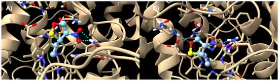 The overall affinities of 1,2-oxathiolanes to CYP51 were in the range of from −3.35 to −3.79 kcal/mol. The affinity to this protein could be considered as rather medium compared to the same conditions that we used in the testing of isoxazolines and isoxazolidines, whose affinities were around−9 kcal/mol []. On the other hand, Pandey et al. [] evaluated the docking scores for novel spirothiazolidinones to CYP51, and their scores were rather low, equal to −4.46 kcal/mol, leading to the conclusion that the introduction of sulfur into the heterocyclic chain could cause a lower binding energy to this protein. Next, we analyzed gelatinase B, which has been found to greatly induce the angiogenesis of cancer cells, in order to study its anticancer properties [,]. The best ΔG value was demonstrated by 3a, and the worst was demonstrated by 6a. This indicates that the cis position of the substituent could cause a worse binding with the pocket of the protein. This was noticed as a sort of a trend in all of the analyzed series. Moreover, the best affinity was demonstrated, in all cases, by 3a and 5a, and in this series of testing, it can be concluded that the trans position of the substituents improved the binding energy. The energies obtained due to the docking to COX-1 and COX-2 also showed rather low affinities in the range of from −4.48 to −5.48 kcal/mol in comparison to the well-known anti-inflammatory agent ketoprofen, which is in the range of −8.70 kcal/mol []. What is more is that the analysis of this series has also shown also that these compounds can create many hydrogen bonds with all of the mentioned proteins, mainly due to the presence of the nitro group and also the nitrogen atom in the heterocyclic chain (Figure 8 and Figure 9). This forms the basis for the confirmation of our previous statement, in that the presence of the nitro group can increase the great bio-active potential of these compounds [,].