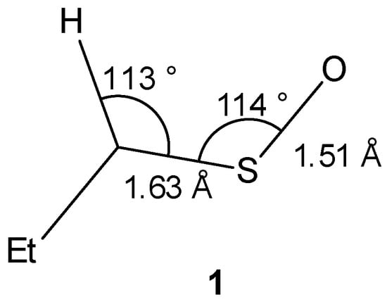 The C=S-O moiety’s geometry is presented in Scheme 4. It is noticeable that the hydrogen atom connected to the sp2 carbon atom of the moiety is iso-planar relative to the C=S-O fragment. The C-S bond is 1.63 Å (elongated compared to circa 1.55 Å in CS2 []), and the S-O bond is 1.51 Å (slightly elongated compared to 1.43 Å in SO2 []).