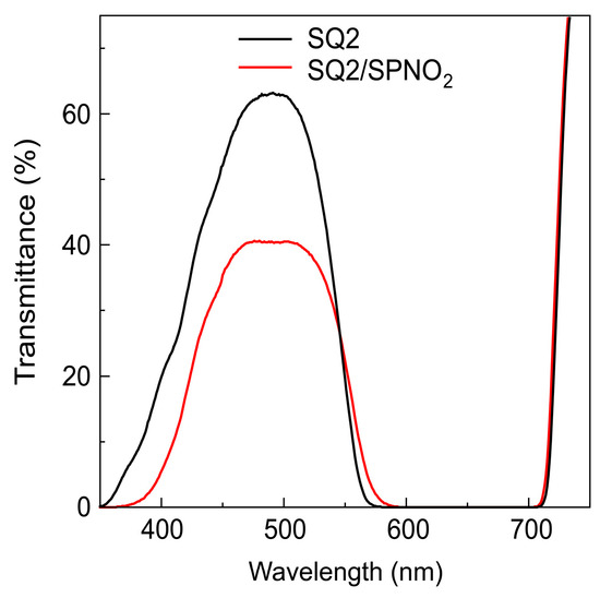 UV–Vis transmittance spectra of SQ2 (black line) and SQ2/SPNO2 photoelectrodes (red line) on TiO2.