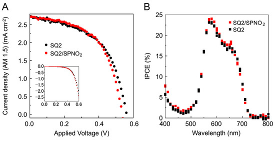 (A) J–V profiles of SQ2-containing and SQ2/SPNO2-containing DSSCs measured under Vis irradiation. The light intensity was 100 mWcm−2. An aperture mask of 0.16 cm−2 was used. The inset shows the dark current density of SQ2-containing and SQ2/SPNO2-containing DSSCs. (B) IPCE spectra of SQ2-containing and SQ2/SPNO2-containing DSSCs measured under 400–800 nm light irradiation.