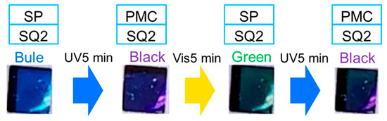 The color of the SQ2/SPNO2-containing photoelectrode surface changed from blue to black after 5 min of UV irradiation, then to green after 5 min of Vis irradiation, and to black after another 5 min of UV irradiation (inset in Figure 3). Initially, the cathode was blue because the SQ2 and SP (closed form of SPNO2) adsorbed on TiO2 were blue and transparent, respectively [17,21]. After 5 min of UV irradiation, the cathode turned black because SQ2 was blue and the photoisomerized SPNO2/PMC was red [17,21]. After 5 min of Vis irradiation, the cathode turned green because SQ2 was blue and SPNO2 was a mixture of transparent SP and red PMC.