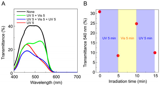 (A) UV–Vis transmittance spectra of SQ2/SPNO2 on the TiO2-based photoelectrode under natural (black line), UV 5 min (red line), UV 5 min + Vis 5 min (green line), and UV 5 min + Vis 5 min + UV 5 min (blue line) irradiation. (B) Intensity of the transmittance at 540 nm (red circles) vs. the irradiation time for the first irradiation (UV for 5 min), second irradiation (Vis for 5 min), and third irradiation (UV for 5 min).