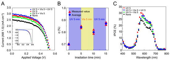 The J–V profiles of the SQ2/SPNO2-containing DSSC were obtained under Vis irradiation (black markers in Figure 5A). The results indicated that electrons were injected from SQ2 into the conduction band of TiO2 nanoparticles, with photosensitization by SQ2. The photovoltaic conversion of the SQ2/SPNO2-containing DSSC with different types of external light irradiation (UV 5 min, Vis 5 min, and UV 5 min) was also observed, as shown in Figure 5A (red, green, and blue markers). η of each marker in Figure 5A was calculated, as shown in Figure 5B, and its values were 0.70%→0.85%→0.78%→0.88% for alternating UV and Vis irradiation (Figure 5B). These results suggest that photovoltaic conversion occurs via light harvesting by PMC and that PMC functions as a photosensitizing dye. Jsc, Voc, FF, and η were evaluated (Table 1) from the J–V profiles of the SQ2/SPNO2-containing DSSC (Figure 5A).