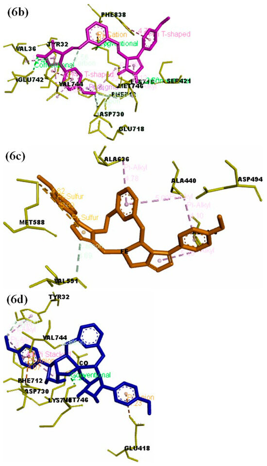 The structure–activity relationship (SAR) between the target protein (3LA4) and the test compounds [(6, 7a, 7b, 7c, 7d, and 7e); Figure 6a–g] were investigated through docking analysis [41,42]. Specifically, 90% residue was found in the preferred region using the Ramachandran plot, with excellent accuracy of both the ϕ and ψ angles of the tested protein’s coordinates (Figure S1; Supporting Information). In silico analysis revealed that the most active compound, 7d, among the series made a stable docked complex with the target protein 3LA4 with a docking score of −10.4 kcal/mol. The SAR showed that both methyl groups formed active hydrogen bonds with the Glu657 and Pro72 residues. The benzene rings were found to have hydrophobic interactions (π–alkyl and π–sigma) with the residues Ala656, Ala228, Pro72, and Leu72. Moreover, the triazole rings of the compound 7d also exhibited stable hydrogen bonding interactions with Asp652, Arg132, and Asp295 (Figure 6d). SAR investigations of 7b exhibited stable hydrogen bonding with the residues of Val744, Tyr32, and Phe712 through the methyl substituent. Interactions such as π–π stacking and π–alkyl bonding were observed between the benzene rings of compound 7b and the residues Phe712, Asp730, Glu418, and Lys716. The oxygen atom of compound 7b, which was also coordinated with Co2+, displayed active H-bonding with the residue Met746 (Figure 6b). Compound 6 also exhibited a wide array of interactions with its neighboring residues, and most of them were conventional hydrogen bonds. The key interacting groups were triazole and pyridine of compound 6 with residues Lys716, Ser421, and Glu742. However, the terminal benzene rings participated in hydrophobic interactions (π–alkyl and π–sigma) with Phe838, Tyr32, Phe712, and Val744 (Figure 6). Regarding compound 7c, the terminal methyl groups were found to engage with the active site residues Glu642 and Val36 through hydrogen bonding. The benzene and pyridine rings of 7c were found to make hydrophobic (π–alkyl) interactions with Lys745 and Lys716. Additionally, H-bonding associations were detected among the triazole rings of compound 7c and the residues Leu839 and Phe840 (Figure 6c). In the case of compounds 7a and 7e, few hydrophobic interactions were observed between pyridine and benzene rings with the residues Ala636, Ala440, Ala436, Met588, Ala554, Asp556, and Pro555. The binding energies of 7a (Figure 6c) and 7e (Figure 6g) suggested that both of these compounds sit closely with each other in the binding pocket of the enzyme (3LA4). Overall, the binding energies and IC50 values exhibited the following trend from lower to higher: 7d < 7c < 6 < 7b < 7a < 7e (Table 6).