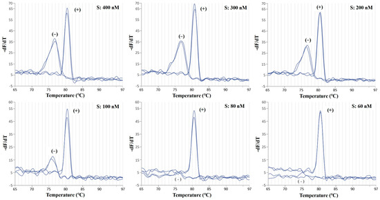 Melting curve analysis of the real-time PCR assay using the primers specific for S. salar. Primers specific for S. salar (coded as S) were studied, with the concentration ranging from 60 nM to 400 nM. (+) represents S. salar; (−) represents the negative control.