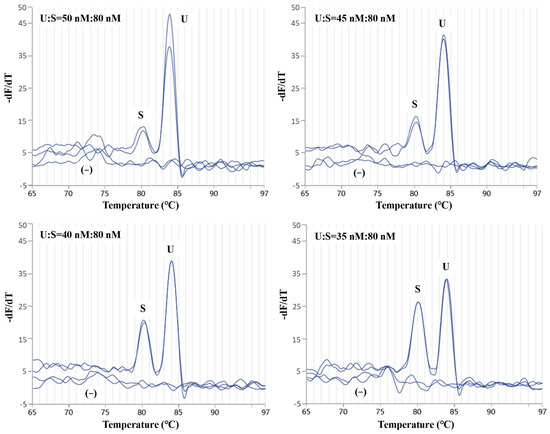 Melting curve analysis of the duplex real-time PCR assay using the universal primers and primers specific for S. salar. Universal primers for Salmonidae (coded as U) were studied, with the concentration ranging from 35 nM to 50 nM. Primers specific for S. salar were coded as S; (−) represents the negative control.