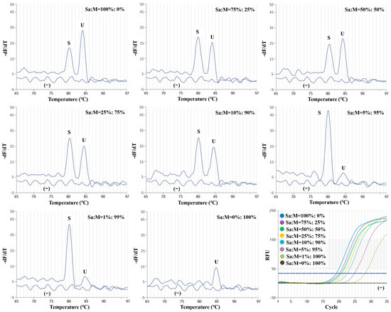Evaluation of the duplex real-time PCR assay regarding simulated tissue mixtures. The addition of increasing amounts of S. salar tissue to O. masou mixtures was simulated; S. salar tissue was coded as S; O. masou tissue was coded as M. Primers specific for S. salar were coded as S; universal primers for Salmonidae were coded as U; (−) represents the negative control.