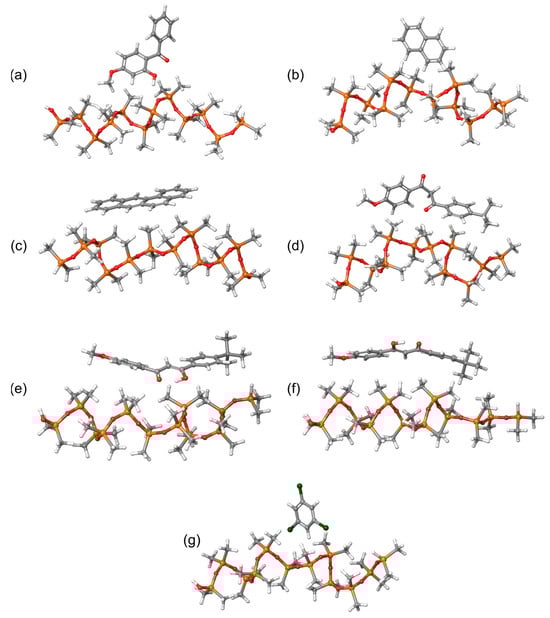 Intermolecular systems consisting of a PDMS chain and (a) oxybenzone, (b) naphthalene, (c) benzo[a]anthracene, (d) avobenzone (keto form), (e) avobenzone (enol1 form), (f) avobenzone (enol2 form) and (g) 1,3,5-trichlorobenzene sunscreen molecules.