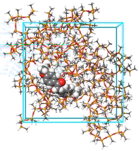 The final step in structure generation was to create systems for molecular dynamics (MD) simulations, which closely mimic real-world conditions, where a single sunscreen molecule is embedded within a PDMS polymer medium. These MD systems, consisting of 19 PDMS chains and one PAH or sunscreen molecule, were constructed using the Packmol program [,], as implemented in the online version of the atomistica.online project [,]. The systems were then subjected to MD simulations using the OPLS3e force field within the Desmond program. A representative system, featuring 19 PDMS chains and an avobenzone (keto form) sunscreen molecule, is illustrated in Figure 5.