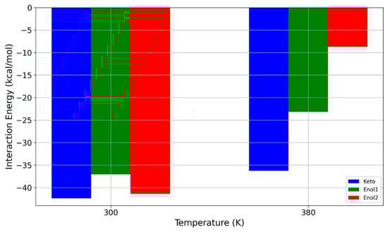 Given that temperature can be effectively controlled within MIMS systems, we first examined how increasing the temperature from 300 K to 380 K, in increments of 20 K, impacted the interaction energy between PDMS and avobenzone. For this detailed exploration, we focused on the keto form of avobenzone, as it exhibited the strongest interaction with PDMS. At 300 K, the interaction energy was highest for the keto form, followed by the enol1 and enol2 forms. The temperature dependence of the interaction energy for the keto form of avobenzone is illustrated in Figure 7.