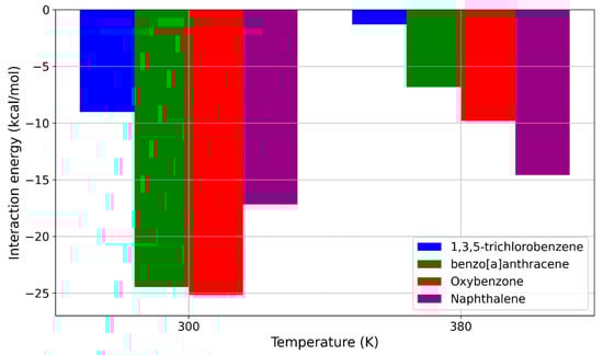 The results presented in Figure 9 suggest that the temperature increase from 300 K to 380 K could be a key factor for the application of pure PDMS membranes in MIMS devices for filtering sunscreen molecules. According to our MD simulations, this temperature rise effectively reduced the interaction energy for nearly all the studied sunscreen molecules below the potentially critical threshold of around −10 kcal/mol, as established in Section 2.2. Among the molecules shown in Figure 10, the most significant decrease in interaction energy was observed for benzo[a]anthracene, where the interaction energy dropped from −24.474 kcal/mol to −6.818 kcal/mol. A similar reduction occurred for oxybenzone, where the interaction energy decreased from −25.169 kcal/mol to −9.796 kcal/mol. The already weak interaction energy of 1,3,5-trichlorobenzene further decreased from −9.029 kcal/mol to −1.322 kcal/mol. At 380 K, the interaction energy for naphthalene remained relatively close to its value at 300 K, decreasing only slightly from −17.193 kcal/mol to −14.578 kcal/mol.