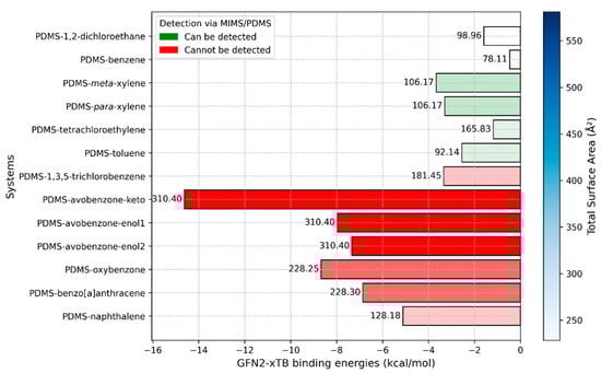 Binding energies between the PDMS chain and selected molecules obtained with the GFN2-xTB method. The numbers on top of the bins represent molecular weight. The intensity of the blue color in the legend indicates the value of the total surface area and is directly correlated to the color intensities of bins. Red bins are related to compounds that current MIMS devices cannot detect, while green bins are related to compounds that can be detected.