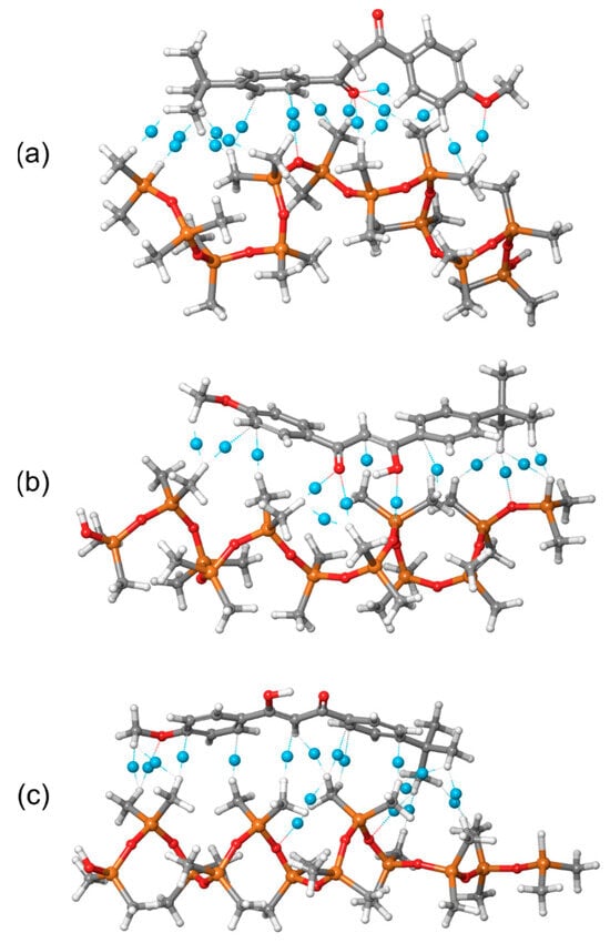 Intermolecular noncovalent interactions between PDMS polymer chain and avobenzone (a) keto, (b) enol1, and (c) enol2 forms (blue dummy atoms are bond critical points).