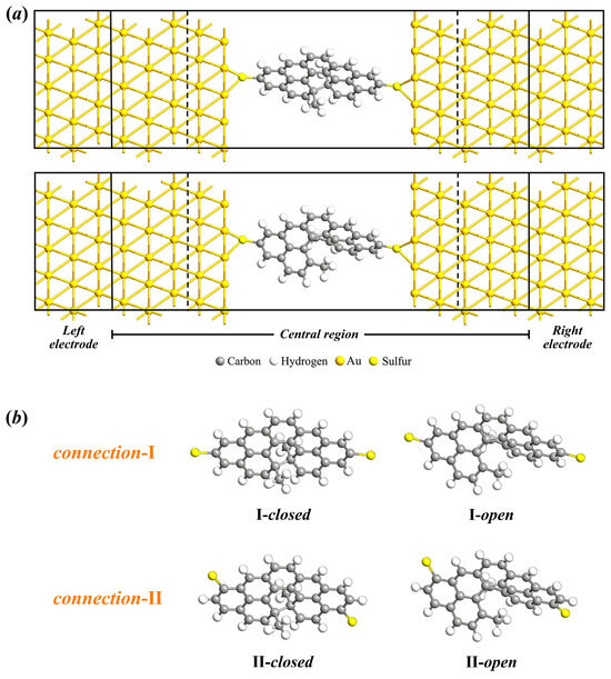 As depicted schematically in Figure 2, molecule junctions are formed by the ring-closed and ring-open isomers of 13,14-dimethylcethrene molecules embedded between two 5 × 5 Au(111) electrodes with distinct molecule–electrode interfaces, denoted as connection I and connection II for clarity. Each junction can be categorized into three parts, i.e., the left electrode, the central scattering region, and the right electrode. In order to gain a comprehensive understanding of the electronic transport characteristics within molecular junctions, rigorous self-consistent calculations were performed. Current–voltage (I–V) curves of molecular junctions consisting of ring-closed and ring-open isomers with diverse anchor attachment sites are presented in Figure 3a. This figure demonstrates a positive correlation between the current and voltage within the specified bias range of [0.00 V, 1.00 V]. For the molecular junctions consisting of connection I, the current flowing through the closed configuration is greater than that in the open counterpart. The observed variation in electronic transport capacity is consistent with the transport characteristics of most molecular photoswitches based on the electrocyclic reaction, where the closed configuration typically exhibits a strong electronic transport capacity compared to the open configuration. In detail, when a dimethylcethrene molecule undergoes electrocyclization and is converted from the open form to the closed form, the molecular junction simultaneously switches from the off-state (low conductance) to the on-state (high conductance). The I–V curves of configurations with connection II depict the opposite transport characteristic, where the current value of the open configuration is much greater than that of the closed configuration, indicating a high-conductance state for the open configuration and a low-conductance state for the closed configuration. There is a significant disparity in the currents of the two isomers, and a fascinating switching effect is observed in the configurations of both connections. Here, the on–off ratio under the given bias is defined as