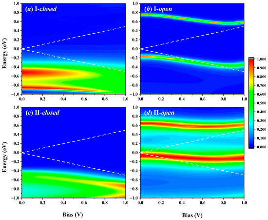 The bias-dependent transmission spectra (Figure 4) show more details on the electronic transport. A significant transmission peak in the open configuration of I and II is observed at the energy position of −0.12 eV, with the bias increase within the range of [0.00 V, 1.00 V], which moves closer to the Fermi level. As is well known, the current value is obtained according to the Landauer–Büttiker formula [45]. The transmission peak of the I-open configuration is narrower than that of the II-open configuration and enters the bias window later. Hence, the II-open configuration shows the most significant current value at the same bias. In contrast, with I-closed, the transmission peak of the II-closed configuration is relatively far from the Fermi level (below −0.40 eV), indicating the lower current value at the same bias in four configurations. The combination of the transmission peak located in the vicinity of the Fermi level and the broadened transmission peak near 0.65 eV results in an extremely high current value of the II-open configuration.