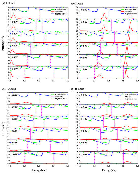 The bias-dependent projected density of states (PDOS) spectra of the (a) closed and (b) open configurations consists of connection I. (c,d) The same case consists of connection II. The projection subspace is segmented into three parts, i.e., the left electrode (green line), the molecule (red line), and the right electrode (blue line). The magenta line indicates the bias window.