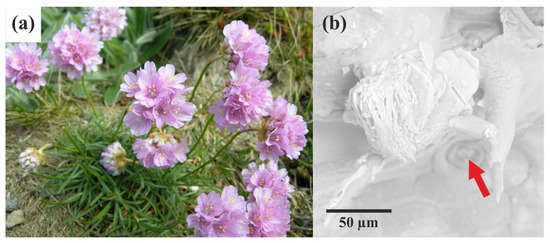Armeria maritima is depicted as follows: (a) a general view of the plant in the flowering phase. This perennial herbaceous plant is characterised by its narrow lanceolate leaves arranged in a rosette and its purple capitate inflorescences (photo: Arnstein Rønning); (b) SEM image showing the salt gland (marked by red arrow) and the polycrystalline material excreted by the gland.