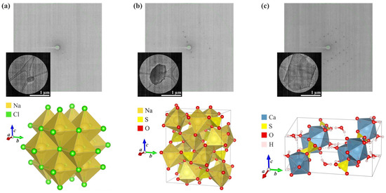 Results of the microED analysis of crystals from the surface of A. maritima leaves (the measured microcrystal, an exemplary frame showing the diffraction signal, and the crystal packing of the compound): (a) sodium chloride (halite), (b) sodium sulphate (thénardite), and (c) calcium sulphate dihydrate (gypsum).