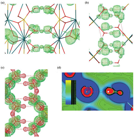 Computational analysis of CaSO4 2H2O system. (a) Analysis of hydrogen bonds with isosurfaces of ELI-D (2.7) along x-90° and z-90° axis. (b) Large basins of ELI-D indicate the regions in which the likelihood of finding an electron pair relative to the whole molecular system is high. A visible basin of ELI-D along a hydrogen bond indicates a significant covalent contribution. ELI-D is a dimensionless quantity. (c) Isosurfaces of ED Laplacian along x-90° axis (0.5 e A−5). (d) Contour map of ED Laplacian along a hydrogen bond.