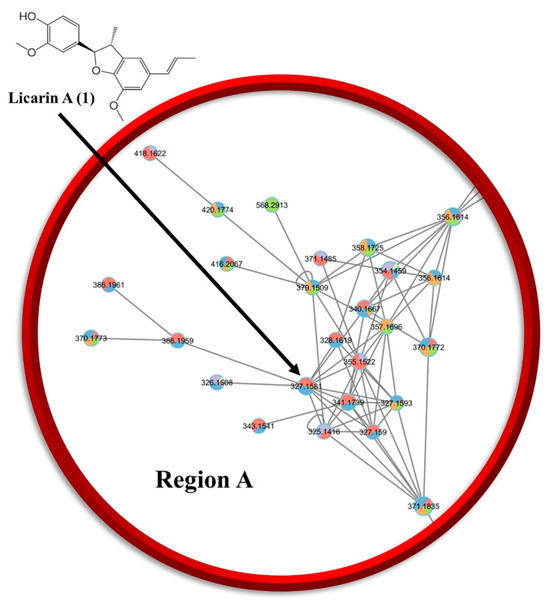 In the present study, preliminary evidence is presented that licarin A (1), as a previously known constituent of mace [15,17], seems worthy of further investigation for its potential cancer chemopreventive activity, with limited toxicity. This was achieved by employing molecular networking and molecular docking processes to identify a compound that could be later validated in vitro and in vivo as part of an innovative approach to cancer chemoprevention drug discovery. Chemoinformatic analysis was performed using the Global Natural Products Social (GNPS) molecular networking of mace and a UHPLC-ESI-Q Exactive system hyphenated with ESI-MS/MS in tandem, employing SIRIUS computational analysis across various databases and CSI:Fingerprint ID for structural annotation [18,19]. Compounds identified within the molecular network correlated to 1 in region A (compounds 3–6) or possessing a similar chemical structure within the neighboring region B (compounds 7–10) were chosen for in silico molecular docking analysis.