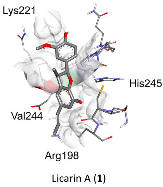 Molecular docking analysis with AutoDockTools 1.5.4 was used to postulate that licarin A (1) binds to NF-κBp65 in a pocket formed by the amino acids Lys-221, His-245, Arg-198, and Val-244, as shown in Figure 3, Figure 4 and Figure 5 and Supplementary Figure S4. The binding affinity (ki) of 1 to NF-κBp65 was calculated as 10.66 μM and was attributed to hydrogen bonding with the amino acids Lys-221 and His-245, π-cation interactions with Arg-198, and π-lone pair interactions with Val-244. The affinity of a structurally similar compounds 3 and 4 correlated to 1 in region A of the molecular network, as shown in Figure 2 and Supplementary Figures S4 and S5, was markedly reduced for the E- (ki = 17.9 μM) and the Z- (ki = 15.54 μM) stereoisomer. Stereoisomers of two other compounds correlated to 1 in region A of the network—5 (E-, ki = 3.58 μM) and 6 (Z-, ki = 7.12 μM)—which displayed improved affinities for NF-κBp65, as shown in Table 1. Compound 7, identified in region B of the molecular network, displayed a similarly potent NF-κBp65 affinity to 5 and 6 with a ki value of 5.3 μM, as shown in Table 1. In contrast, compound 8, which correlated to 7 in region B, had a reduced affinity to NF-κBp65 (ki = 37.5 μM). However, compounds 9 and 10 displayed an improved affinity (ki = 8.20 μM and ki = 15.01 μM, respectively) compared to 8. In comparison, the binding affinity of 1 and the compounds identified in the molecular networking study was much more selective to PARP-1 than NF-κBp65.