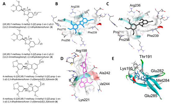 Molecular docking for the SIRIUS CSI: FingerID structural predictions with NF-κBp65. (A) Structures of 3–6. (B–E) Docking profiles for 3 (blue, B), 4 (gray, C), 5 (pink, D), and 6 (cyan, E) with NF-κBp65.
