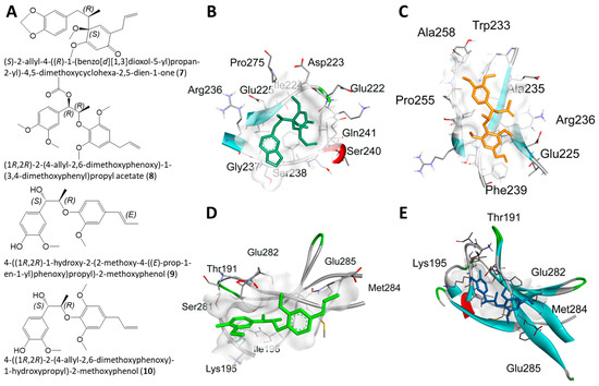 The stereochemistry of the GNPS library hits used in the docking study were justified by searching within the LOTUS database for their previous isolation from natural sources. The stereochemistry of the GNPS library hits were verified and chosen if they had previously been isolated using the LOTUS database for subsequent molecular docking studies [27]. For the GNPS library hits 7–10, all have been previously isolated as recorded on the GNPS database. Additionally, the stereocenters for all these compounds are located at carbons 1 and 2. Due to the differing locations to licarin A, we justified the use of the R and S configuration at carbons 1 and 2, respectively, for compound 7, as it has been previously isolated from M. fragrans [27]. For compound 8, the same configuration as licarin A was used for both stereocenters (1R, 2R), as shown in Figure 5. Compound 8 was chosen with this configuration, as it is located in neighboring region B in the molecular network rather than in region A containing licarin A. Compounds 9 and 10, also found within region B of the molecular network, possessed the S configuration at carbon 1 and the R configuration at carbon 2 for the molecular docking simulations in order to assess the activities of the opposing configuration.
