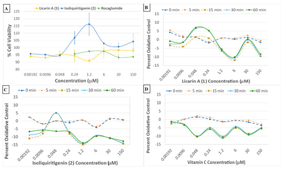 (A) Crystal violet viability data for compounds 1 and 2, and the rocaglamide positive control, with the DU-145 prostate cancer cell line. (B–D) Cell oxidative stress real-time dose–response assay profiles of 1, 2, and vitamin C, respectively, using Hepa1c1c7 mouse hepatoma cells.