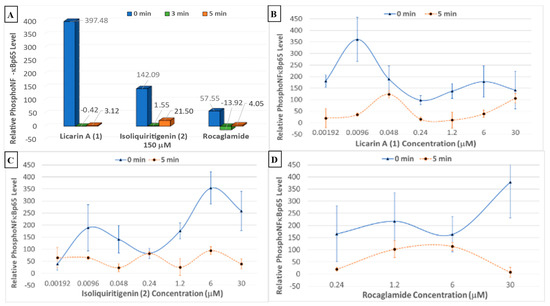 (A) Phosphorylated NF-κBp65 levels after treatment with 150 μM of 1, 2, and rocaglamide with the DU-145 prostate cancer cell line. (B–D) Individual phosphorylated NF-κBp65 levels after treatment with 1, 2, and rocaglamide, respectively, using the DU-145 prostate cancer cell line.