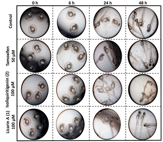 Representative images of the observed morphological toxicity of tamoxifen, licarin A (1), and isoliquiritigenin (2) in a zebrafish model.