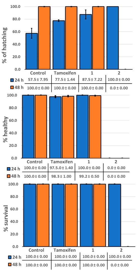 As shown in Figure 8 and Figure 9, a 50 μM concentration of the clinically utilized drug tamoxifen as positive control was well tolerated in the zebrafish (Danio rerio) model used, until 48 h after administration, at which point these organisms displayed certain developmental abnormalities, including a curved or shortened spine, with this drug exhibiting the second highest number of abnormalities of the three compounds tested, consistent with similar results to a previous report [36]. In contrast, the neolignan 1 was well tolerated by the zebrafish at a higher dose of 100 μM after 48 h, as evidenced by both their 100% survival and lack of morphological changes. On the other hand, administration of 100 μM of 2, a natural cancer chemopreventive control product, was toxic to the zebrafish as early as 24 h after administration, with all fish in the cohort displaying curved spines or shortened tails with 100% hatching, resulting in their death before 48 h, similar to previously published results [21]. This demonstrates the potential improved safety profile of 1 relative to 2.