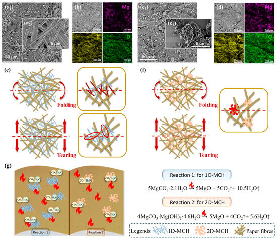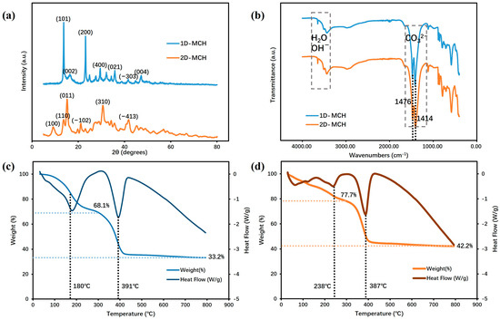 Figure 2c,d) that the ratio of water and carbon dioxide released by 1D-MCH after complete decomposition is higher, and the loss of its bound water begins at 180 °C, while the decomposition of 2D-MCH begins below 100 °C. The relatively high thermal stability and high levels of water and carbon dioxide in the composition are both reasons why 1D-MCH is able to show better flame retardancy.