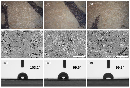 Figure 3 that the deposition of material formed a good microscopic filling between the paper fibers. Especially in the 1D-MCH-treated sample, the filling compactness between fibers was significantly improved. At the same time, the contact angle of paper samples had no significant change, which indicates that the treated paper still maintains a certain hydrophobicity. Furthermore, the results of the chromaticity change show that the effect of protection treatment on paper chromaticity is in an acceptable range (