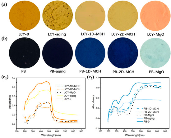 2)), which can be avoided to the greatest extent by adjusting the dosage and action mode of protection materials. For 1D-MCH- and 2D-MCH-treated samples, the type and position of the peaks in UV absorption bands remain unchanged, indicating that the protective material did not damage the color mechanism of the pigments. In contrast, commercial MgO had a serious effect on the color of LCY and PB. The UV curve changed obviously, and the color of LCY turned red, while PB almost completely faded. This kind of undesirable consequence may be due to the formation of more alkaline Mg(OH)