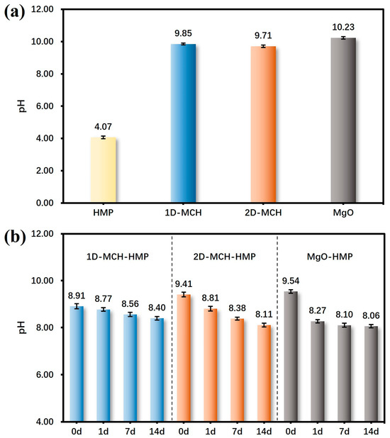 Figure 5b displays. Although the results of the tests immediately after coating showed that the alkalinity of the 1D-MCH-coated samples were not highly alkaline, with a pH below 9, after 14 days of dry-heat aging, the pH of this group of specimens remained at a high level, which indicates that the material has a good durability in terms of deacidification. In comparison, the 2D-MCH-treated samples showed a mediocre alkaline persistence, which may be related to the stability of the alkali carbonate. However, the pH of the commercial MgO-treated samples showed a large change from the first day of accelerated aging, decreasing from 9.54 to 8.27. After 14 days, the pH of this group of specimens was the lowest, indicating that it has a quick- rather than slow-release action.