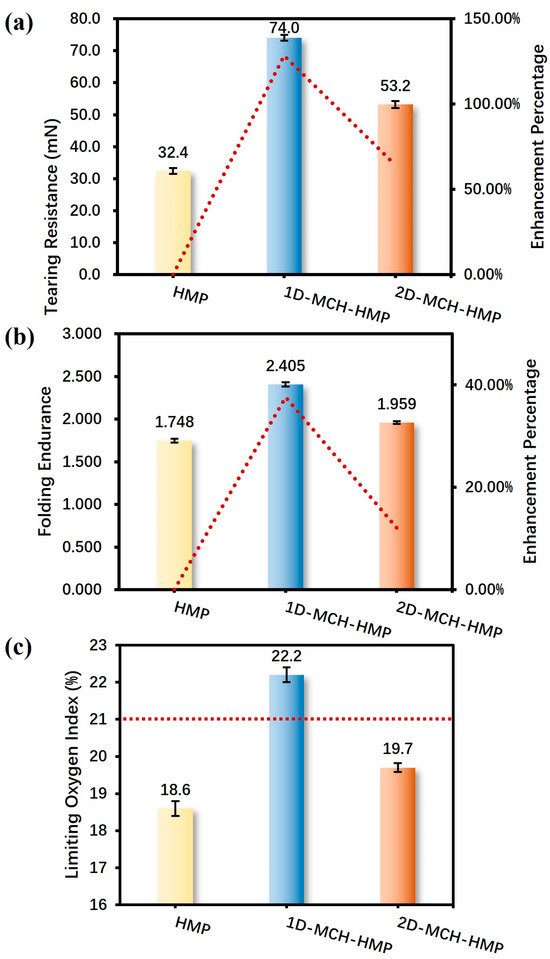 Figure 6), which increased by ca. 128.4% (1D-MCH) and 64.2% (2D-MCH), respectively, compared with uncoated paper. It is obvious that 1D-MCH is better than 2D-MCH in improving the mechanical properties of paper relics, although the latter one can already achieve good results. Further, the test results of the ultimate oxygen index show that both types of low-dimensional materials with different morphologies can have a certain flame retardant effect on HMP (
