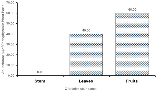 The percentage of occurrence of fungal endophytes in S. mauritianum and the relative abundance (%) of fungal endophytes in S. mauritianum plant parts are shown in Figure 1 and Figure 2. Penicillium chrysogenum and Fusarium sp., the most occurring fungal endophytes, are obtained from most plant parts of S. mauritianum, while the fruits of the plants appear to be the parts most rich in endophyte diversity (in regard to the stems and leaves). This finding is inconsistent with the findings of Yu et al. [20], who opined that the leaves are the richest with endophytes compared to the fruits of the Camellia oleifera plant. This inconsistency could be due to differences in plant species, environmental interference, and methods employed for the isolation of endophytic microorganisms. In maize plants and woody plants, the leaves have been touted as the most endophyte-rich parts of the plants [20,21]. In this study, P. chrysogenum and Fusarium sp. were the most frequently occurring fungal endophytes from S. mauritianum, while the fruits and then the leaves had the highest relative abundance of fungal endophytes in the invasive plant species. Almost all plant species harbor fungal endophytes, which can asymptomatically colonize different parts of the plants, including the roots, stems, leaves, branches, and fruits [22].