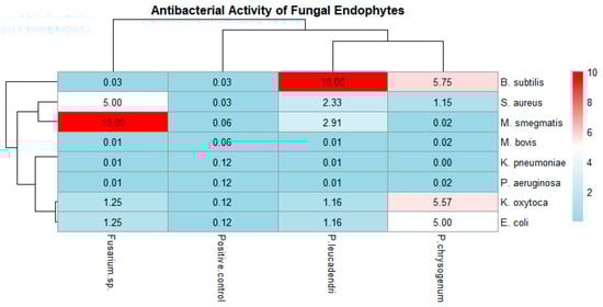 Pheatmap showing antibacterial activity/effectiveness of crude fungal endophytes against pathogens of public health importance. B. subtilis (1), S. aureus (2), K. oxytoca (3), K. pneumoniae (4), E. coli (5), P. aeruginosa (6), M. bovis (7), and M. smegmatis (8). The colors of each cell indicate the level of antibacterial activity measured by their respective MICs. The positive control was Rifampicin (40 µg/mL), and the crude extracts of fungal endophytes are presented in mg/mL.