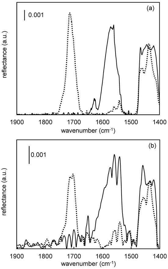 A Fourier-transform infrared (FTIR) spectrometer equipped with an external polarization modulation module was employed to record the PM-IRRAS spectra. The instrument was equipped with a mercury cadmium telluride (MCT) detector, which was cooled with liquid nitrogen. In order to acquire the highest reflectance amplitude, the polarized IR beam was emitted at the samples at an 80° angle to the surface normal. The spectra were averaged over 128 scans at 3 cm−1 resolution.