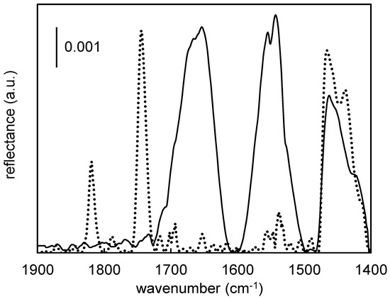 PM-IRASS responses of a modified 316L SS surface. The dotted line represents the response of an NHS activated surface, whereas the solid line represents that of an Fn-modified surface. Similar spectra were recorded with modified CoCr and NiTi surfaces (see Figure S1 in the Supplemental).