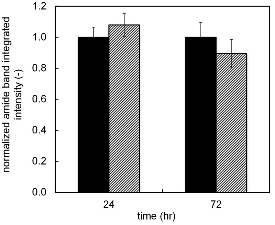 Time dependence of the normalized integrated intensity of the amide I vibration of a covalently immobilized Fn on an MUA-modified 316L SS surface before (solid bars) and after (patterned bars) exposure to simulated laminar flow (PBS, pH = 7.4, T = 37 °C, 20.8 mL min−1) for 24 and 72 h.