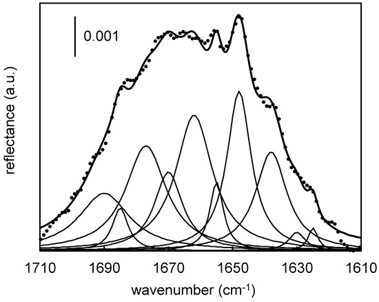 In this study, PM-IRRAS was used to obtain information about the secondary structure of Fn chemically immobilized on a 316L SS surface through an MUA monolayer (Scheme 1). Figure 5 shows a sample of the corresponding amide I peak deconvoluted to its secondary structure components (thin solid lines), following the assignments in Table 1 [57,58]. It can be seen that the composite simulated peak (thick solid line) fits the experimental data well. A good agreement was likewise obtained with the replicate samples.