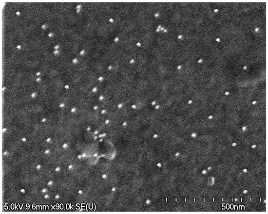 Gold nanoparticles of a smaller diameter can yield a higher labeling efficiency [71]. Therefore, in this study, 18 nm commercial gold nanoparticles conjugated to a secondary Fn antibody were used. In order to obtain higher contrast images of gold nanoparticles, a backscattered electron (BSE) detector was used in SEM imaging; however, due to the presence of various heavy elements in the underlying 316L SS alloy, even with the BSE detector, the SEM imaging was performed with an extreme effort to obtain acceptable contrast at a high magnification [72]. Figure 6 shows the resulting SEM image of an Fn/Au-functionalized commercial 316L SS coronary stent surface.