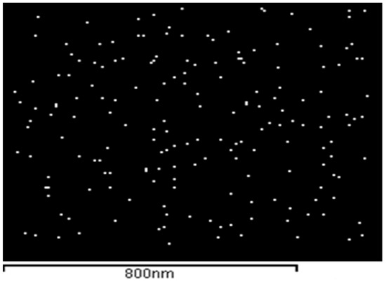 In order to further verify the distribution of Fn on the surface, EDX analysis was applied to carry out gold elemental mapping. Since there was no gold in the 316L SS alloy substrate, the Au peaks were resolved to yield a high contrast spectroscopic map of gold nanoparticles on the surface, Figure 7. However, the AuMα1 X-ray peak position, which is much more intensive than the AuLα1, could not be used in the mapping because of its overlap with the SKα1 peak of the thiol groups of the MUA; therefore, the AuLα1 line was used instead.