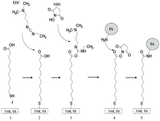 Covalent immobilization of fibronectin (Fn) onto a 316L stainless steel surface. (1) MUA film formation, (2) formation of COOH-EDC activated complex, (3) replacement of EDC by NHS to form an NHS-terminated film, (4) replacement of NHS with Fn, and (5) final structure of an Fn-modified 316L-SS surface [22].
