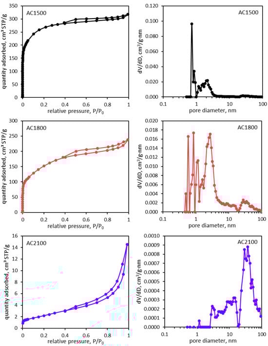 Nitrogen adsorption–desorption isotherms (left side) and pore size distribution dV/dD plots (right side) determined for the activated carbon samples.