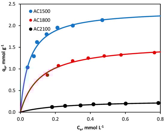 The obtained qm (but also KL) values increase in the order AC2100 < AC1800 < AC1500, which is closely correlated with the specific surface area of the adsorbents tested (Table 1). Thus, the herbicide adsorbed best on AC1500 carbon, which has the highest BET surface area (969 m2·g−1), and least on AC2100 carbon, which has the lowest specific surface area (8 m2·g−1).